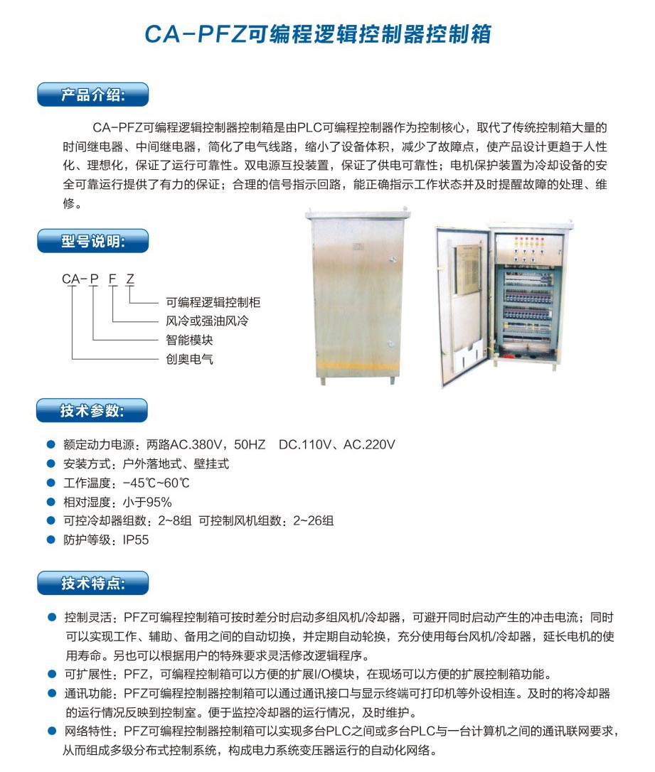• CA-PFZ可編程邏輯控制器控制箱是由PLC可編程控制器作為控制核心,取代了傳統控制箱大量的 時間繼電器、中間繼電器,簡化了電氣線路,縮小了設備體積,減少了故障點,使產品設計更趨于人性 化、理想化,保證了運行可靠性。雙電源互投裝置,保證了供電可靠性;電機保護裝置為冷卻設備的安 全可靠運行提供了有力的保證;合理的信號指示回路,能正確指示工作狀態并及時提醒故障的處理、維 修...